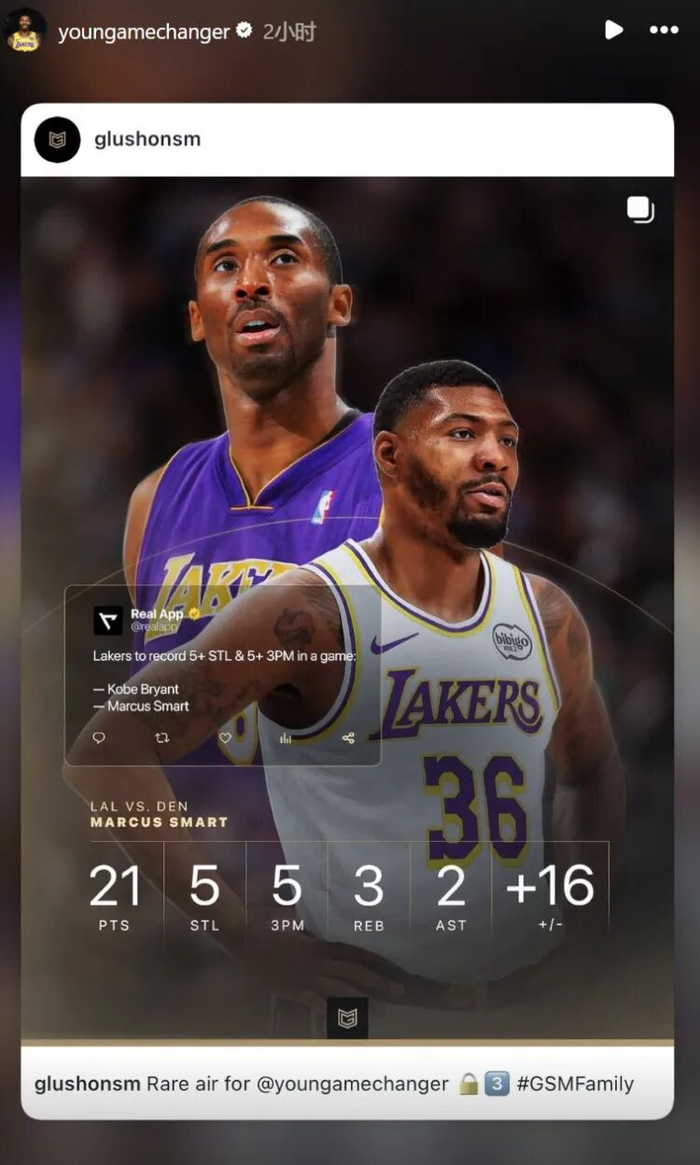 据统计,斯玛特单场至少5抢断5三分,湖人队史第二人,比肩科比。
