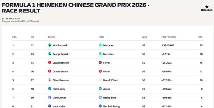 3月15日的正赛亮点十足。法拉利赛车起步迅猛,但很快被梅奔赛车完成反超。安东内利持续领跑,汉密尔顿、勒克莱尔与拉塞尔展开位次争夺。最终,安东内利与拉塞尔稳稳包揽前二,法拉利车手汉密尔顿超越队友勒克莱尔收获季军,梅奔成功拿下本赛季前两站冠军(此前澳大利亚站拉塞尔已夺冠)。